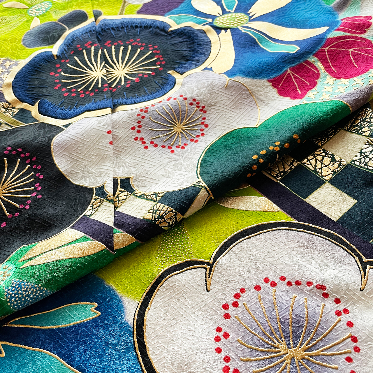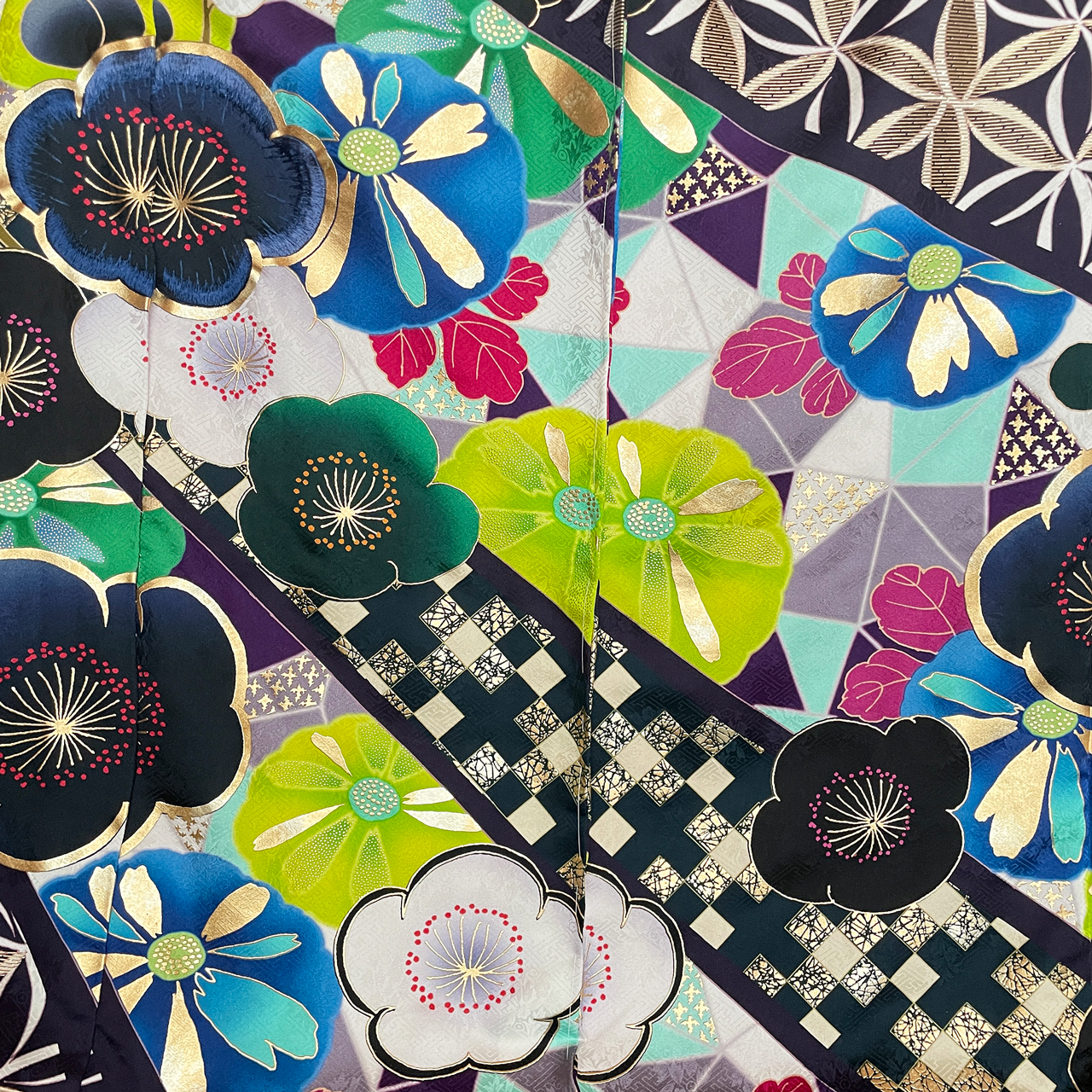 洋色系のブルー、グリーン、ピンク、バイオレット、そしてホワイトを使った花の色。柄・柄付けは古典ながら、その大胆な色合いと柄配置により、モダンな振袖に仕上がっております。みよ志乃オリジナル振袖。