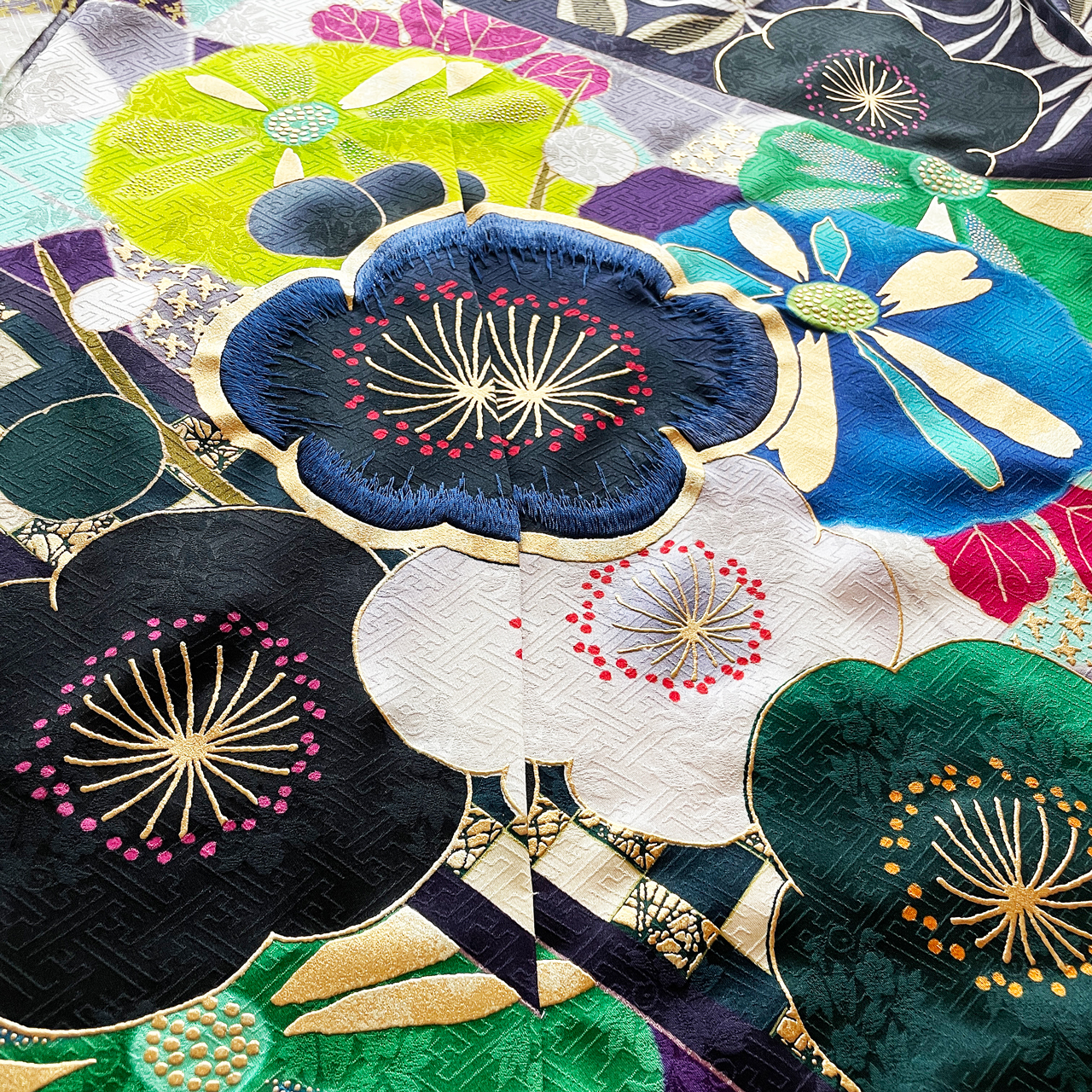 ※「道長取り」とは、複数の違う柄や模様をちぎって貼り合わせたように、曲線的に区切って配した文様のことを言います。その名の通り、平安時代に藤原道長が好んだことからこの名前が付けられたと言われています。