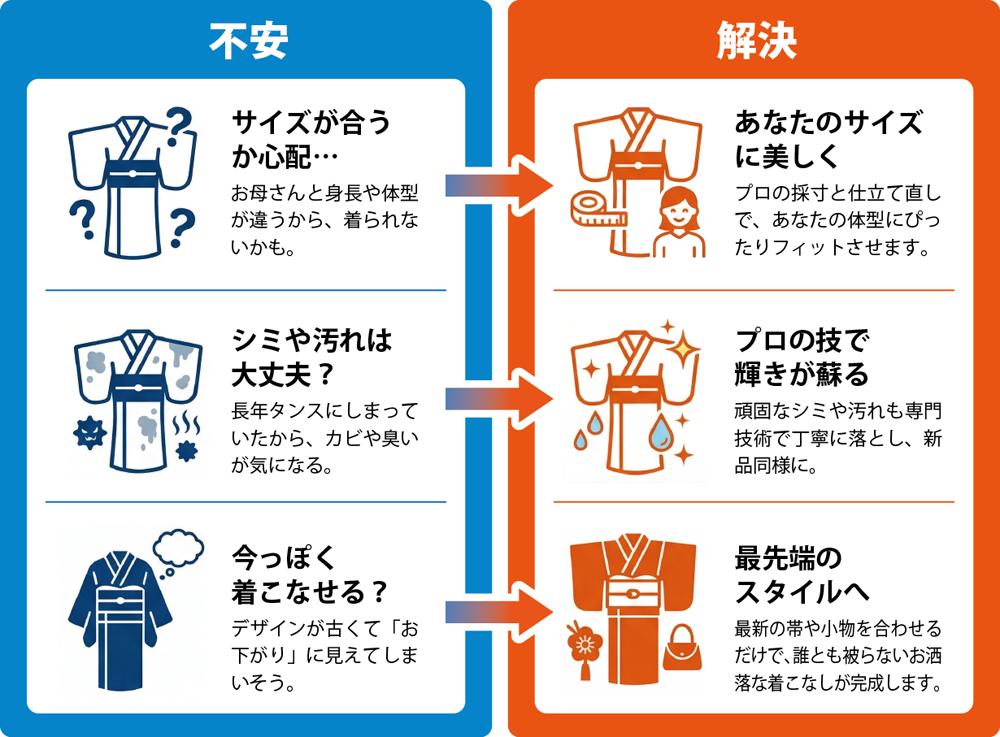 みよ志乃は、振袖をただ着せるだけの場所ではありません。 呉服専門店として培った確かな目利きで、長年の眠りによるシミや汚れを丁寧に落とし、お嬢様の体型に合わせて美しく仕立て直します。